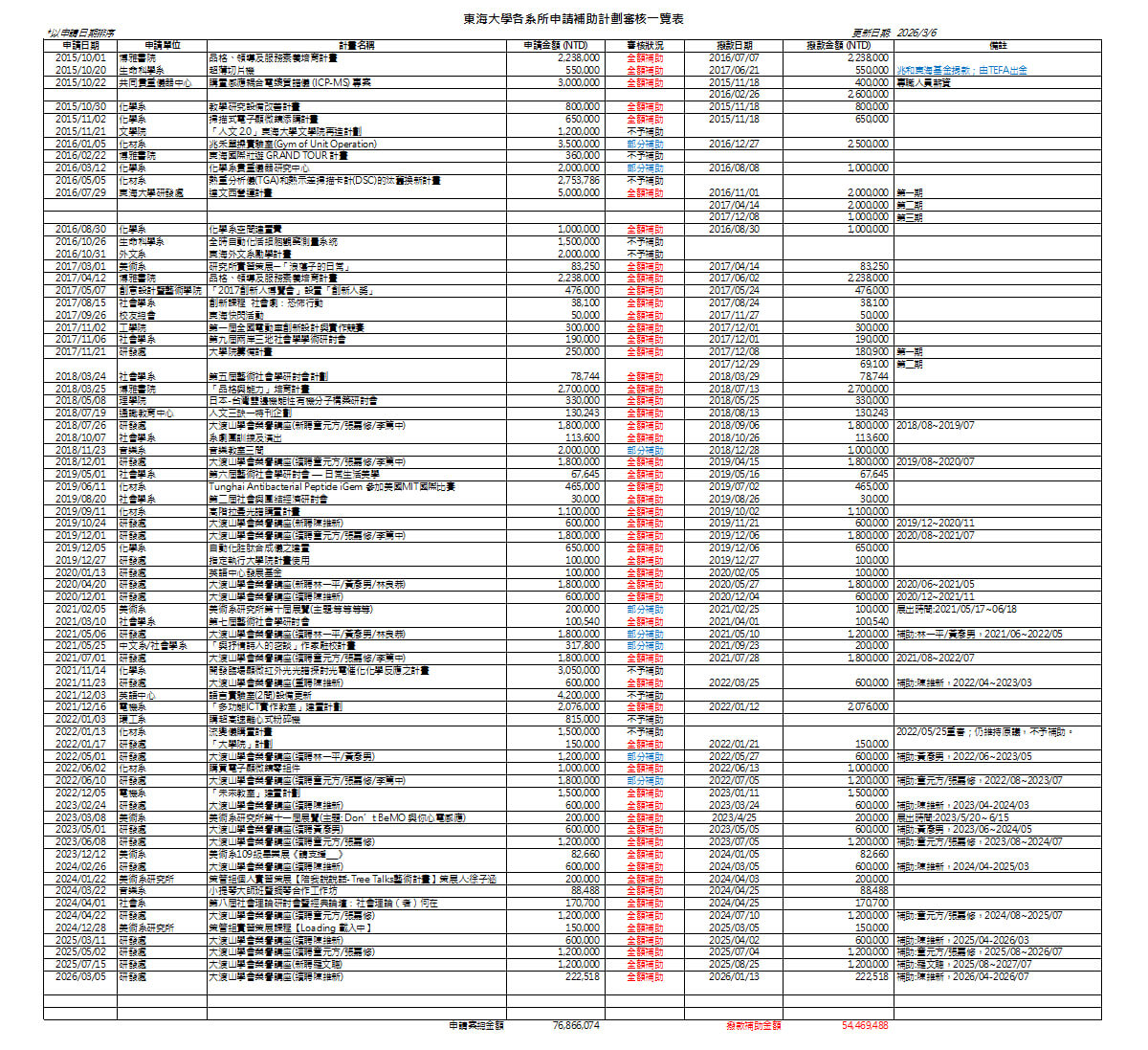 附錄: 東海大學系所補助申請計畫審核一覽表